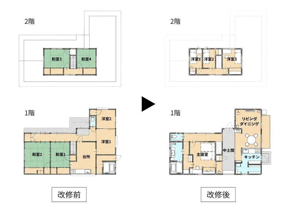 半世紀前の古い間取りを、現在のライフスタイルに合わせてフルリノベーション。構造上の制約をクリアしながら、ご家族が広々とくつろげる空間と、4つの個室(4LDK)を確保しました。「古い家でもここまで変わる!」という、リノベーションならではの劇的な変化を実際のスケールでご体感いただけます。