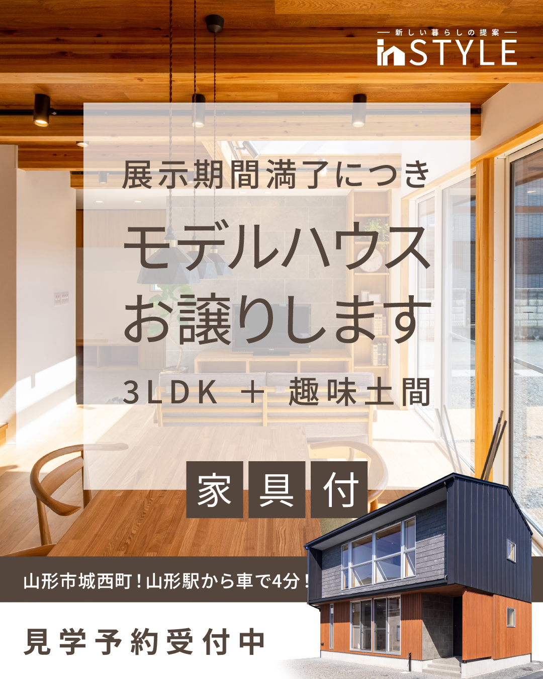 モデルハウス展示期間満了に付き、家具・エアコン付きでお譲りいたします。