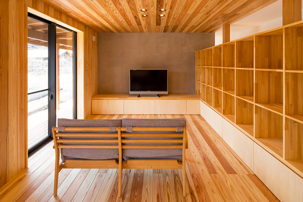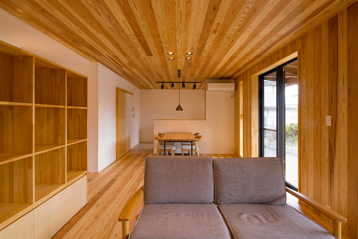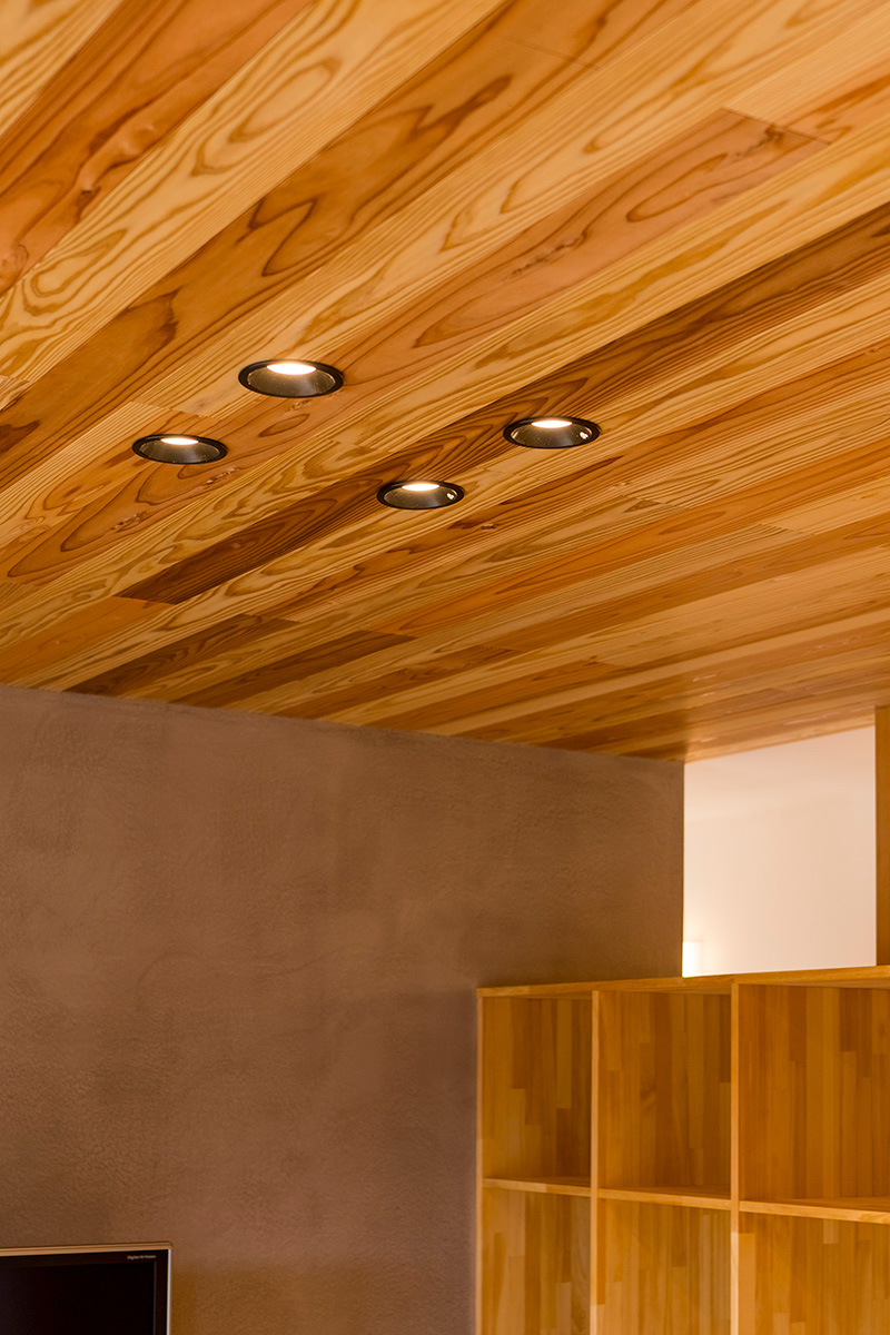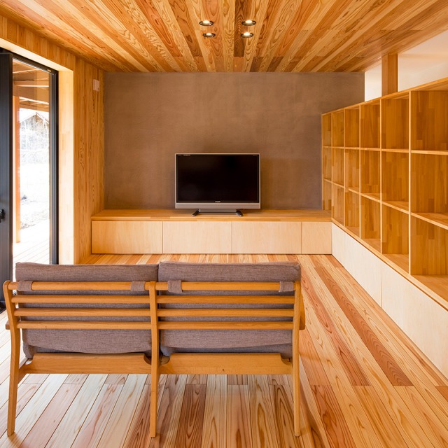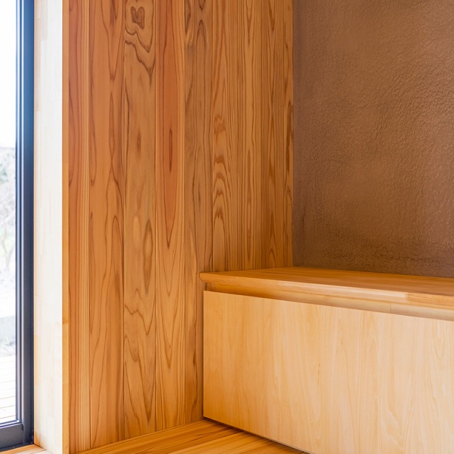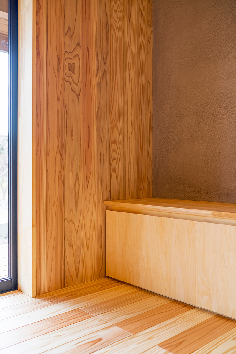 床だけでなく一部の壁にも同じ杉材を使うことで、やさしい木の香りとぬくもりが広がります。