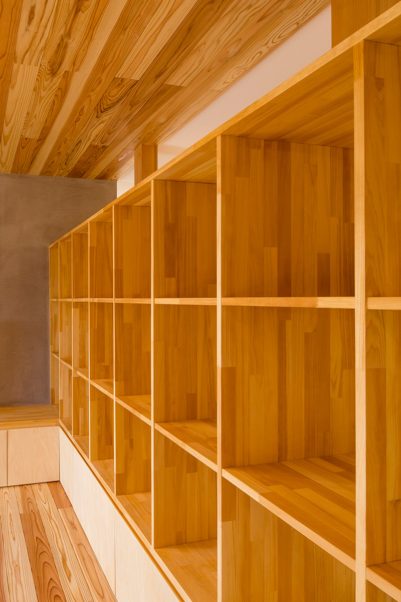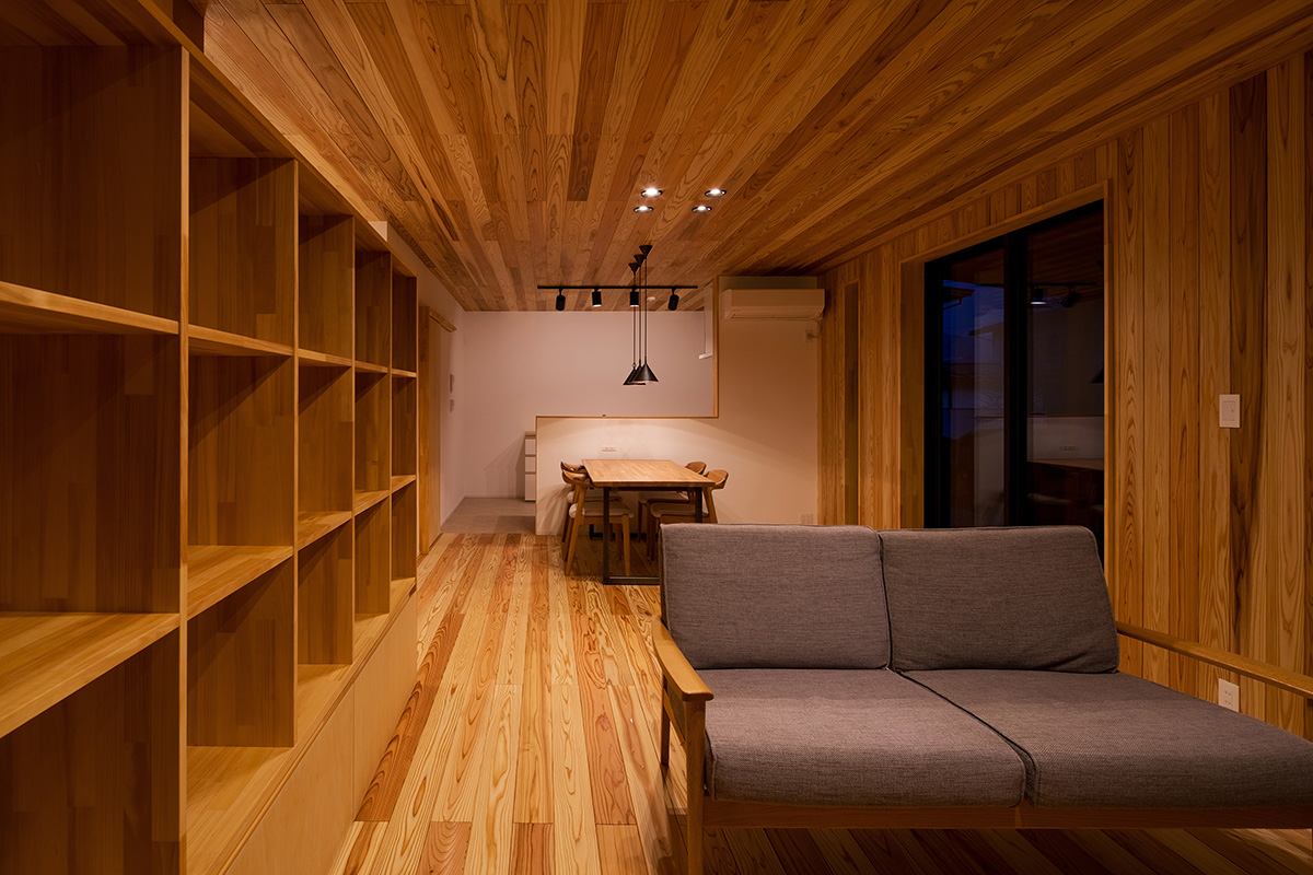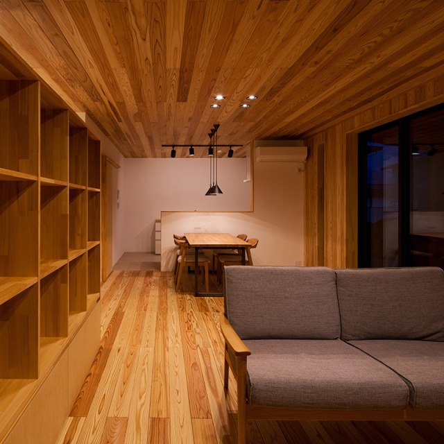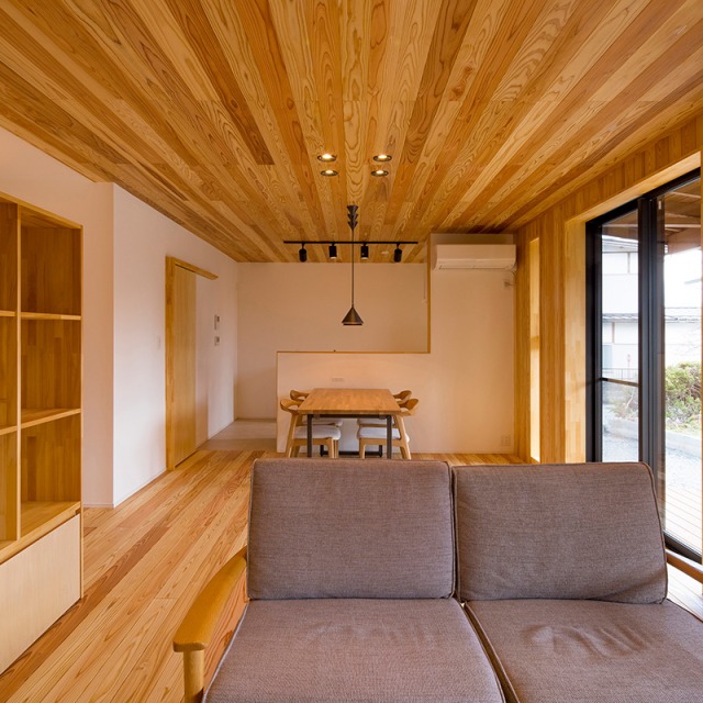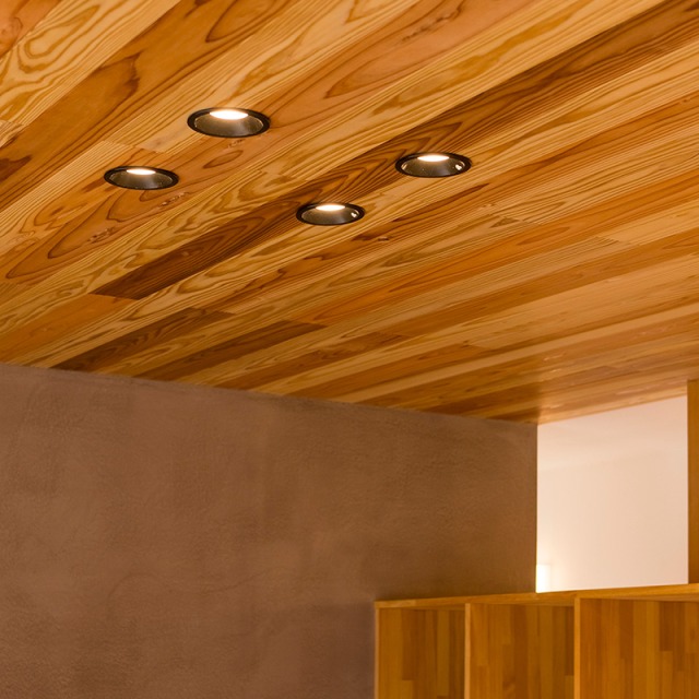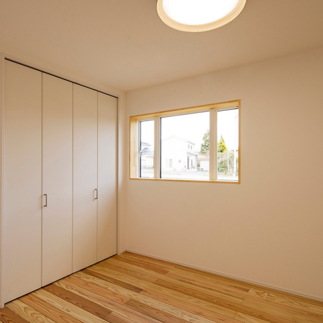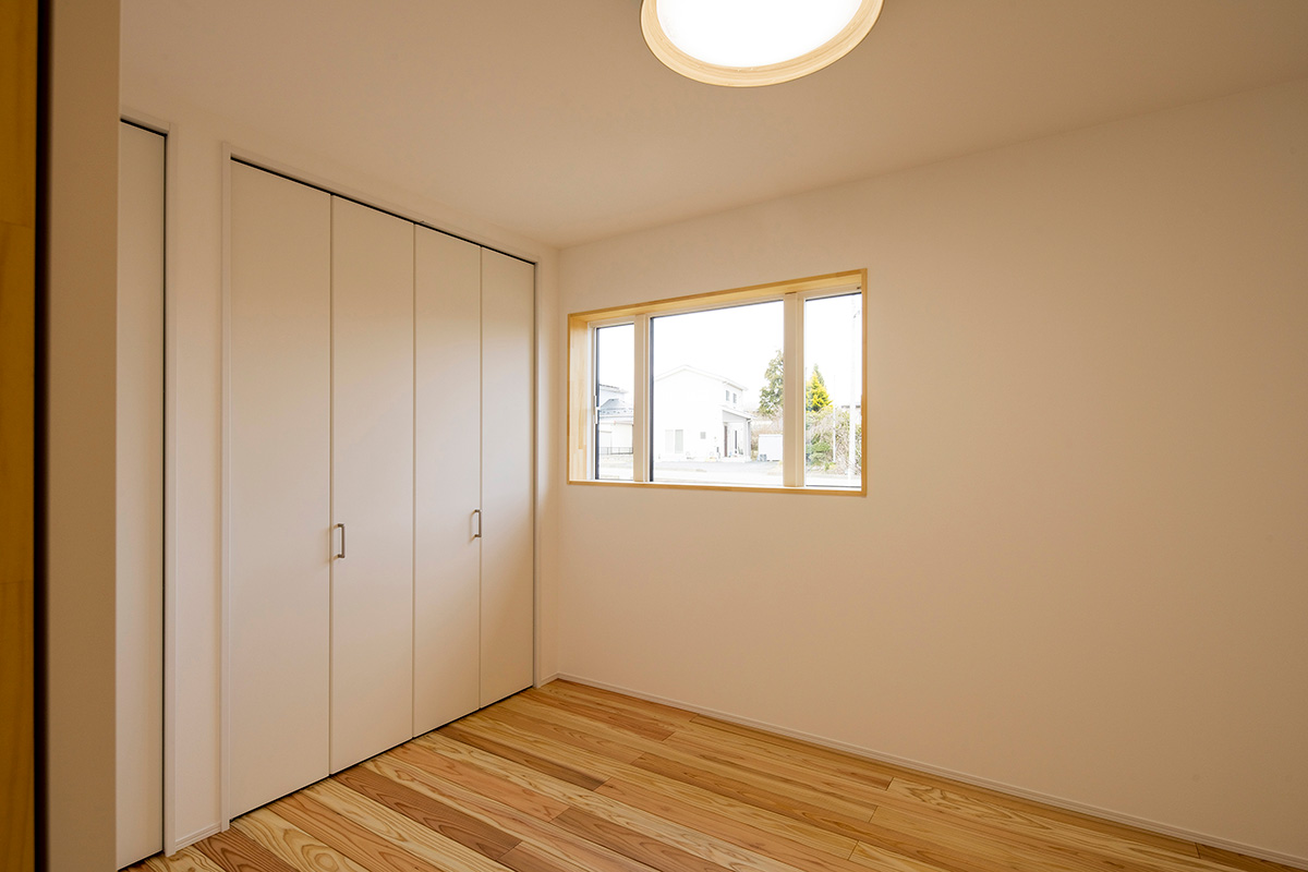 床だけでなく一部の壁にも同じ杉材を使うことで、やさしい木の香りとぬくもりが広がります。